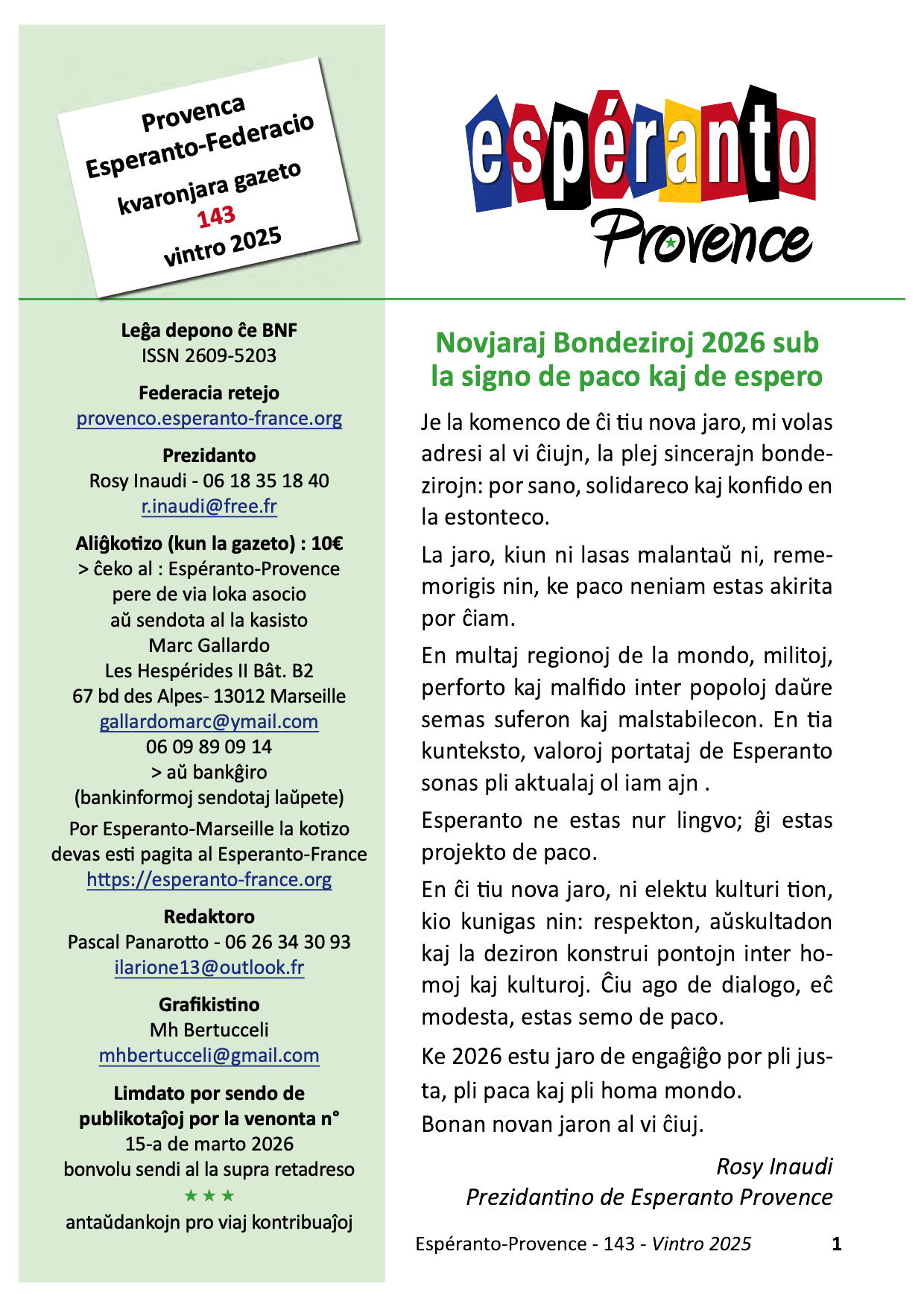 cet article en espéranto : Aktuala numero de nia kvaronjara gazeto : 143 - vintro 2025